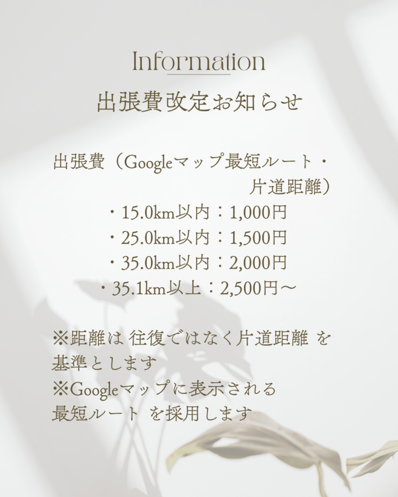 いつも訪問美容コッコレをご利用いただき、誠にありがとうございます。 2026年1月より、移動距離および所要時間の実情を踏まえ、出張費を 距離に応じた料金体系 へ変更させていただきます。 これまで岡山市・倉敷市エリアは一律 […]